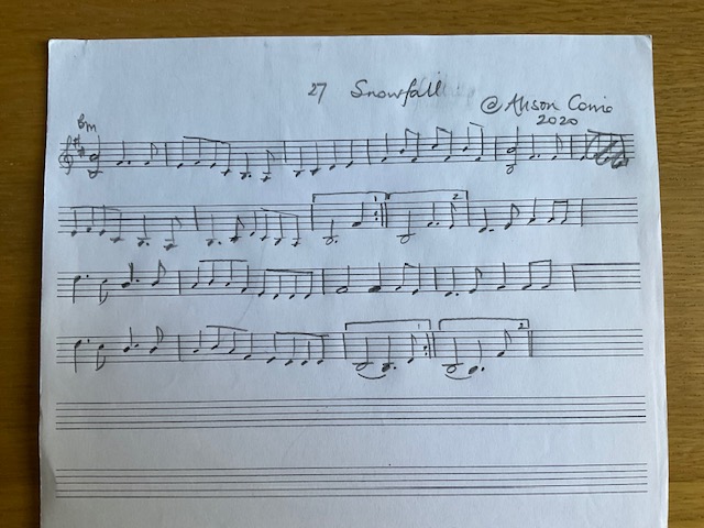 - Snowfall – David and I had a few days away staying in a wee bothy in Nethy Bridge in February 2020 – snow was falling! By this time, I had discovered the old-time session at the Argyle and was heading home, musically speaking…
